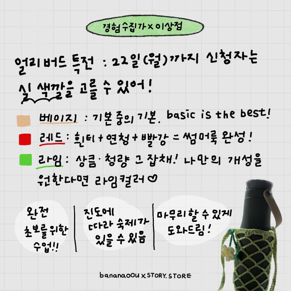 ** 미리 재료를 준비해야하기 때문에 결제 후 취소가 어렵습니다. 만약 스케줄 변동이 있으시다면 문의 게시판 혹은 인스타그램(@story.store_) 디엠으로 문의 주세요!!!!**